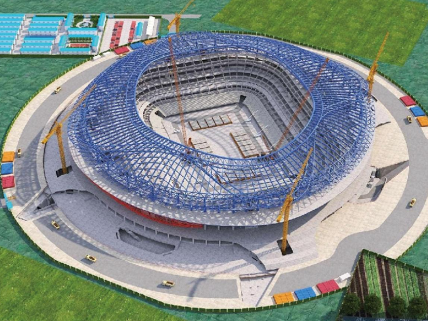 山東首個(gè)6萬(wàn)座專業(yè)足球場(chǎng)完成屋蓋鋼結(jié)構(gòu)首吊